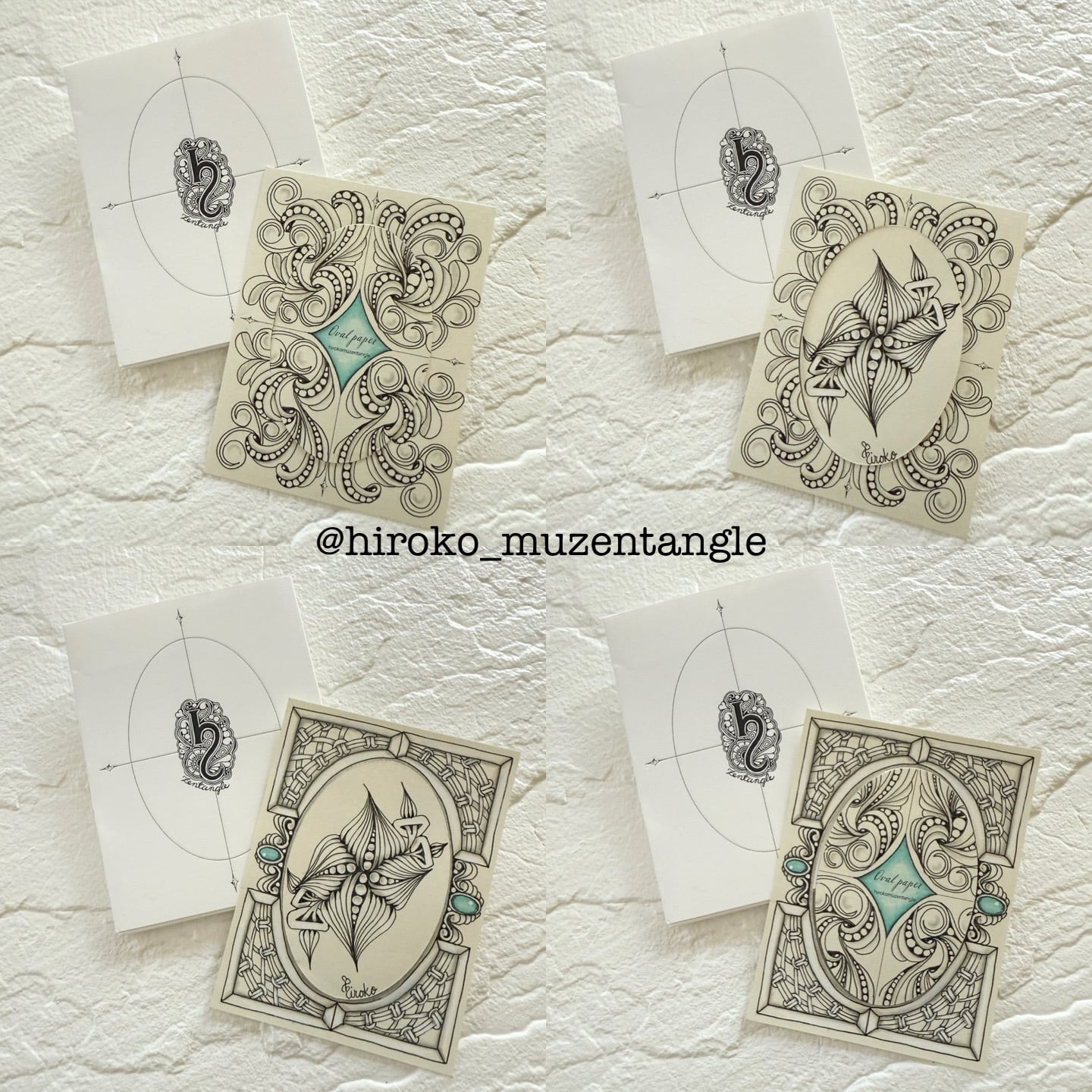 表や裏面に描いて1枚で4パターン楽しめます。違うカラーに描いて入れ替えるとまた違った印象の作品に♪ メッセージカードやフォトフレームに入れて飾ったり、中央に写真を入れてPP05で紹介された“Zentangle cartouche”もお勧めです!